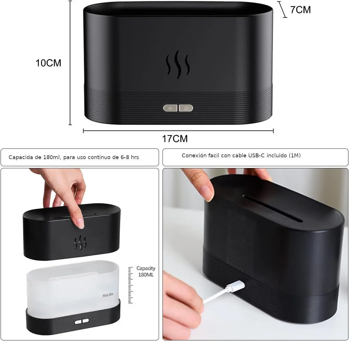 Conexión USB (Cable incluido)Depósito de agua: 180 ml.Peso del difusor: 420gr.Caudal: 15-20 ml/hrSalida de Voltaje: DC5V/2Amp